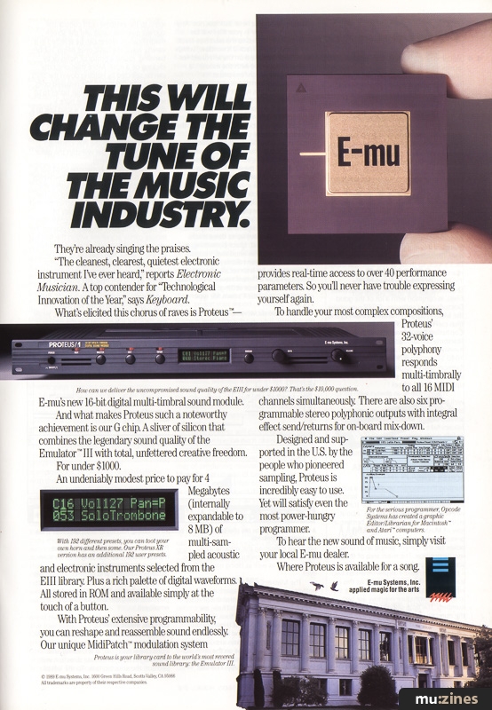 <ref name="mz8972-emu-systems-proteus">{{cite magazine|name=Emu Systems Proteus|date=Mar 1990|title=Emu Systems Proteus|page=51|url=http://www.muzines.co.uk/ad/8972|magazine=Sound On Sound|publisher=SOS Publications Ltd.|location=United Kingdom|access-date=2025-10-11}}</ref>