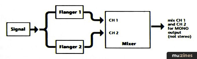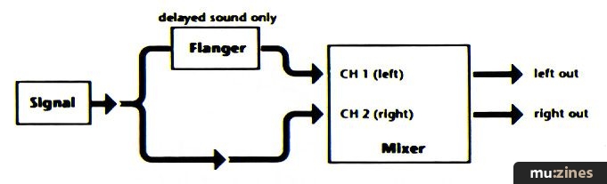 This one is a little tricky to get right, and you'll have to split the signal into two channels: one into the flanger and one straight into an amp (see Figure 1). However, if you're playing through two amps or want to take a mono track from a tape recorder and make it stereo, this is a useful technique.