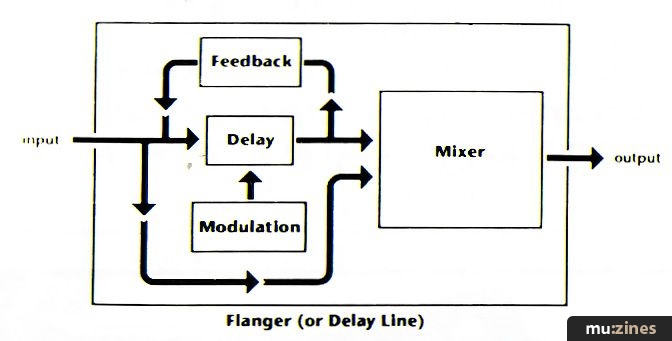 An initial delay control sets the delay line's delay time. However, just leaving the delay at one setting produces a fairly static effect that is more like equalisation than a special effect. So, a modulation section sweeps the delay time in a cyclic manner to add some motion to the sound (like a tremolo or phase shifter). There should also be a depth (or width) control that lets you vary the range of this sweep from a subtle modulation to a wide range sweep that more closely resembles tape flanging.