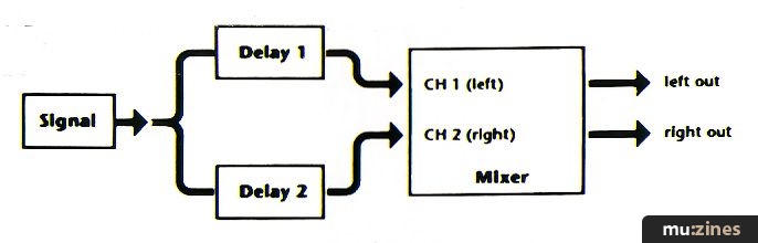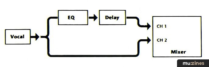 Two delays (Figure 3) can definitely sound better than one, especially if they're set to different delay times. Set both units for the same proportion of delayed and dry sounds, as this will place the dry sound in the centre of the stereo image. I've found that setting the shorter delay to between 60% and 80% of the longer delay time works very well; for starters, try adjusting the longer delay to about 150 milliseconds, and the shorter delay to about 100ms.
