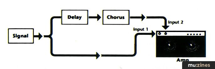 Although generally thought of in the context of reverberation, delaying a signal prior to chorusing, flanging, filtering, or envelope filtering can help diffuse the delayed signal a bit and put it more in the background, compared to the 'dry' signal. Figure 5 shows a setup using a two-channel amp, but you could use two separate amps for stereo, instead.