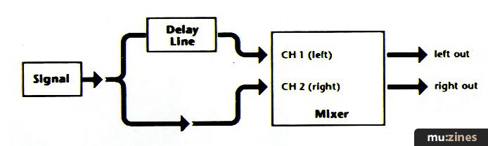 Set the flanger for no modulation, delayed sound only, and no regeneration. As you increase the initial delay control, you'll widen the stereo image until, at longer delay settings, you'll hear a slapback echo. The delayed sound may not be quite as hi-fi as the dry sound, so you might want to lower the level of the delayed channel just a bit. Although this shifts the stereo image towards the dry channel, the increase in fidelity may be worth it.