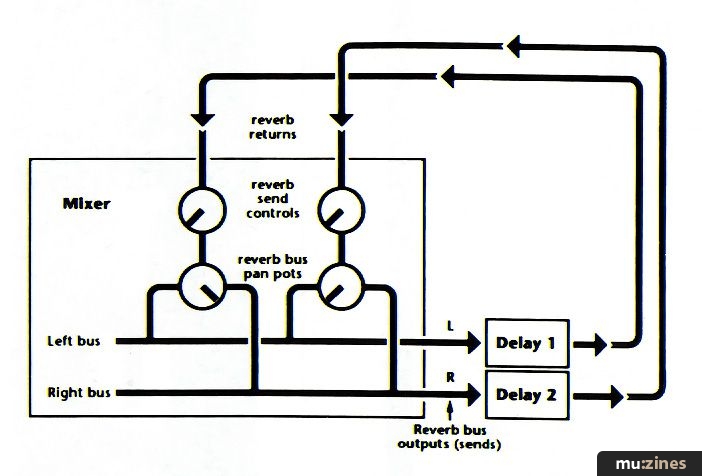 This is a fairly complex patch, but it gives a coarse, rude, 'grainy' reverb sound that you probably won't find as one of the preset programs in your preset digital reverb box. This requires two delay lines, along with a mixing console that features a stereo auxiliary bus (Figure 8). The object is to cross-pan the outputs and inputs of the two echo units. The aux sends add regeneration, so don't turn them up too far, or you'll create runaway regeneration effects.