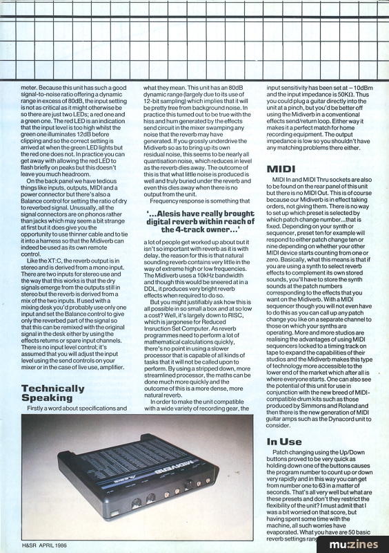 I could enthuse about this product for hours but the only way you'll find out how good it is is to go and listen to it or get the Sound Technology demo cassette. The fact that Alesis have really brought digital reverb within reach of the 4-track owner must make it one of the most significant budget recording products yet and the days of the spring reverb are now well and truly numbered. It isn't the best digital reverb that money can buy but you'll need a lot more than £400 if you are going to get anything significantly better.