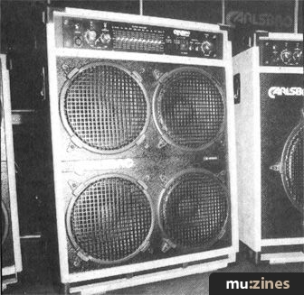I had a chance to examine the new Carlsbro range of bass amplification more closely. These are all based around the same 150W head which follows the modern, and laudable fashion of using a graphic eq section with no additional tone controls. The facilities are pretty comprehensive; eq may be selected either as pre-shaped or through the 11-band graphic. There are both 1/4" phono and XLR inputs, a compressor which is controlled by the input gains, which are marked pre and post, meaning pre compressor and post compressor. The Preamp volume is set by the post control, and the amount of compression is set by the pre control; the higher the setting, the less the amount of compression, which is actually the opposite of what I'd expect, but in any case works perfectly well and gives a good range of control. There are LEDs for power amp overload and preamp level to ensure that optimum s/n can be achieved, and overall volume levels are set by the power amp volume control. There's a DI out which can be switched to pre and post eq, and effects send and return sockets. I did try out the amp with an EMG-equipped bass, which is obviously a low noise instrument, but the whole system seemed admirably noise free and tonally versatile if obviously derivative, so if you're in the market for a high quality bass amp this head, at £303 is worth checking out; it's also available as a combo with a variety of speaker configurations.