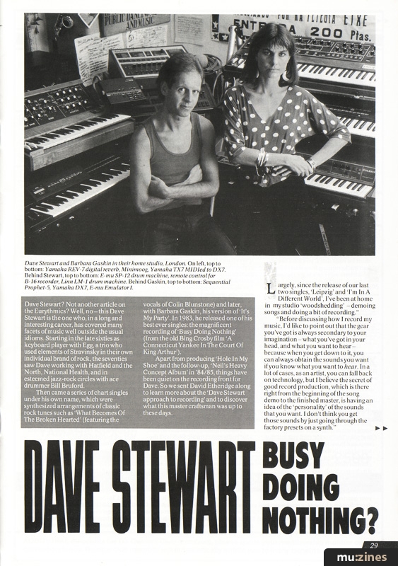 Apart from producing 'Hole In My Shoe' and the follow-up, 'Neil's Heavy Concept Album' in '84/85, things have been quiet on the recording front for Dave. So we sent David Etheridge along to learn more about the 'Dave Stewart approach to recording' and to discover what this master craftsman was up to these days.