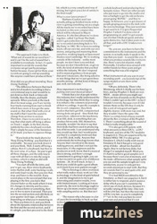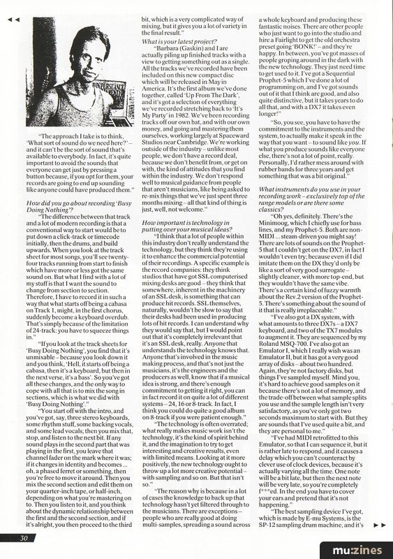 "The reason why is because in a lot of cases the knowledge to back up that technology hasn't yet filtered through to the musicians. There are exceptions - people who are really good at doing multi-samples, spreading a sound across a whole keyboard and producing these fantastic noises. There are other people who just want to go into the studio and hire a Fairlight to get the old orchestra preset going 'BONK!' - and they're happy. In between, you've got masses of people groping around in the dark with the new technology. They just need time to get used to it. I've got a Sequential Prophet-5 which I've done a lot of programming on, and I've got sounds out of it that I think are good, and also quite distinctive, but it takes years to do all that, and with a DX7 it takes even longer!"