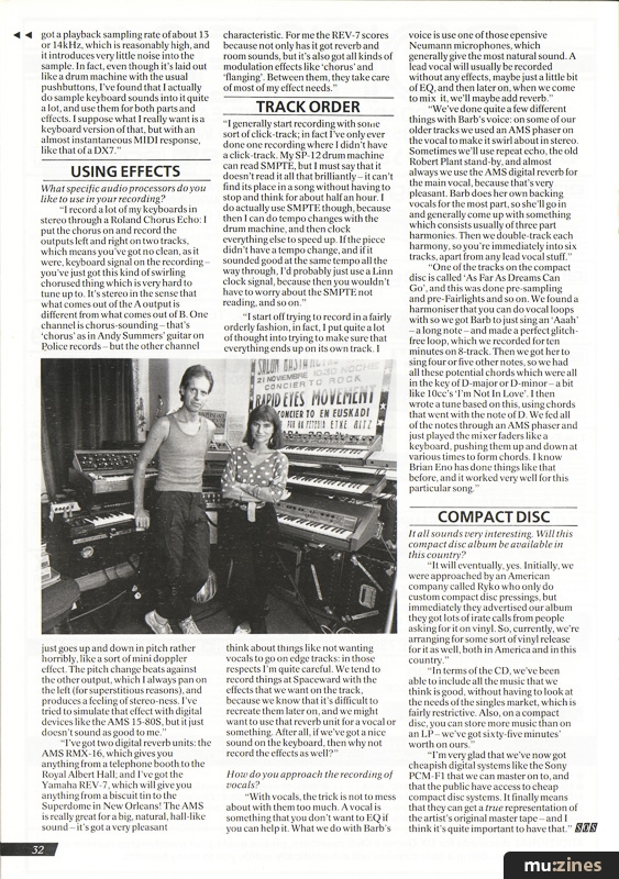"We've done quite a few different things with Barb's voice: on some of our older tracks we used an AMS phaser on the vocal to make it swirl about in stereo. Sometimes we'll use repeat echo, the old Robert Plant stand-by, and almost always we use the AMS digital reverb for the main vocal, because that's very pleasant. Barb does her own backing vocals for the most part, so she'll go in and generally come up with something which consists usually of three part harmonies. Then we double-track each harmony, so you're immediately into six tracks, apart from any lead vocal stuff."