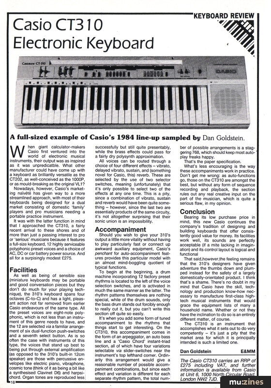 It was with the latter function in mind that I approached the CT310, a fairly recent arrival to these shores and of more than just a passing interest to pro or 'serious' musicians because it features a full-size keyboard, 12 highly serviceable polyphonic preset voices and a choice of AC, DC or car battery power source. And all for a surprisingly modest £275.