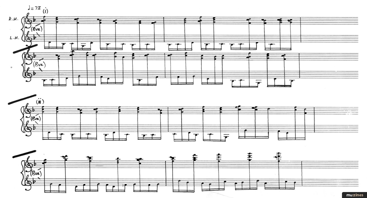 Another factor which contributed to the epic length was my desire to develop some of the initial musical ideas. For example, the rhythm keyboard part which features in the intro (some of which I showed you last month) seemed full of possibilities for expansion and development. As you will recall, the part (played with both hands) was originally something I improvised into a sequencer. See Figure 1 for a transcription. Note the brief excursion into 5/16 at the beginning of (ii), a legacy from my polymetric days.
