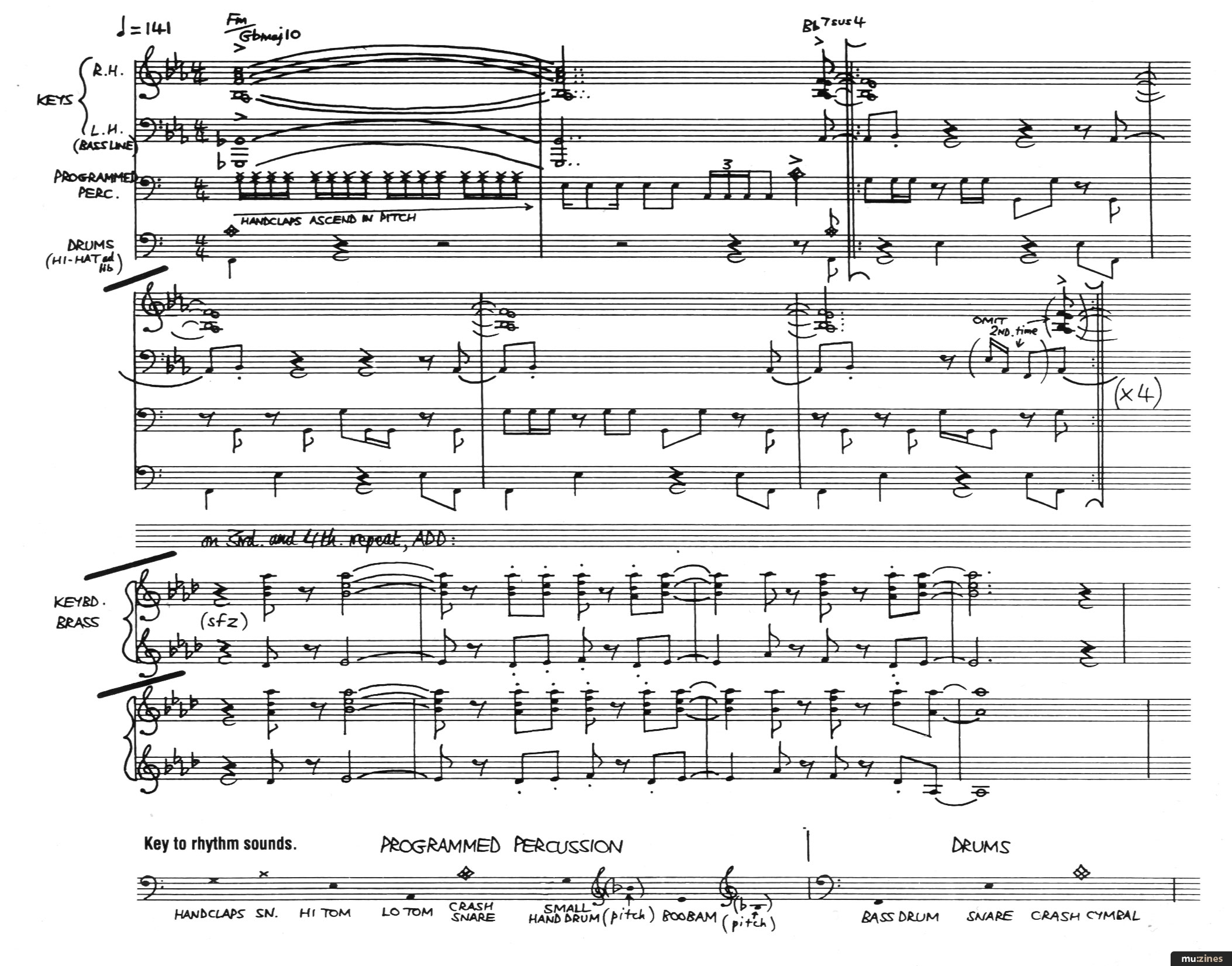 Four big, accented chords give way to a tense sustained chord under which pizzicato strings spit and bubble, building up to the climactic re-entry of the blaring brass tune featured in the intro. While none of these parts are particularly difficult or complex, the unusual quality of some of the voicings and progressions gives the song a distinctive sound. It always surprises me that more people don't use chords like these! Please try the parts on your keyboard if you can (and watch out for the occasional Cb) — I hope you'll agree with me that simple-sounding pop music can still contain interesting musical ideas.