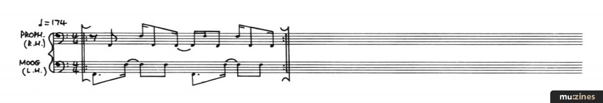 The trouble with this sound combination was that it could often become overbearing. Both these antique analogue synths (which, I note with amusement, have now come back into fashion) have a big bottom end, and after spending hours gleefully programming a huge, buzzing Prophet sound like the one I employed for the aforementioned track, I'd often end up with a combined bass sound that sounded fantastic on its own, but was simply too big and powerful to work with other instruments. After a little work re-programming the Prophet (this done with a certain amount of regret), I came up with some relatively sensible bass sounds that blended more subtly with the Moog. This enabled me to play faster stuff like the 2-handed rhythm pattern in Figure 2, featured in a song called The Emperor's New Guitar' that I recorded in the early 80s.