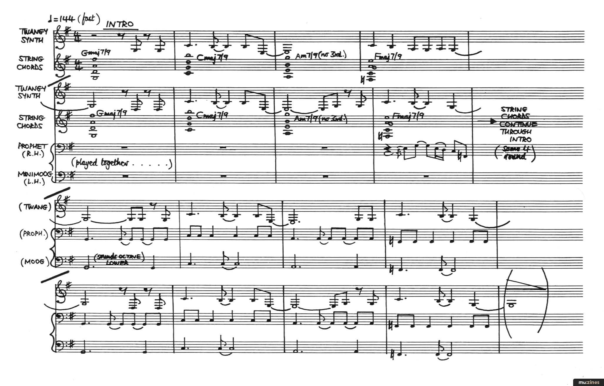 Figure 3 shows the keyboard arrangement for the start of 'Shadowland', incorporating the 2-handed bass line. The Prophet sound I used was a fairly powerful, distorted, guitar-like program with the oscillators tuned in 5ths, and a bit of built-in release which meant I could play staccato but still get a legato effect. The MiniMoog was set to a standard kind of booming bass patch, oscillators set to 16' and 32' (ah, the old church organ terminology) and no filter resonance (which tends to take all the body out of bass sounds). Occasionally I needed the Prophet to change to a unison program, so I enlisted Barbara's help in pressing buttons at the right points, being personally rendered helpless in classic Savage pose.