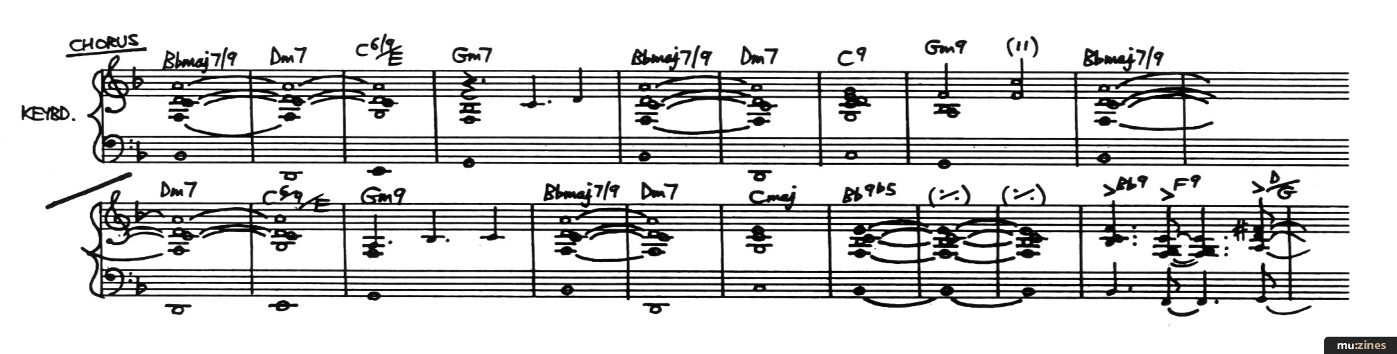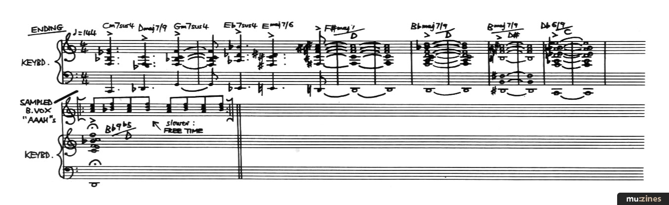 For those interested in exploring other sections of 'Shadowland' and not just reading this article to savour the hip words 'analogue' and 'MiniMoog' before turning to the burningly crucial, fearlessly investigative software reviews, Figure 4 shows the chorus chords and Figure 5 the end of the song, a sort of accented chordal melody straight out of the 70s — goes with the synths, really. Good grief! Surely I didn't play those last couple of chords live, did I? They both use about 15 notes! I suspect that here I must have enlisted the help of Little Dave, the talented many-limbed performing sequencer unit brought to you by the Roland Corporation of Japan (pause for 5-second musical interlude, applause, and gasps of admiration). As the last chord hits, I introduced a sampled, breathy backing vocal loop of alternating minor and major triads sung by Barbara. There is a brief flurry of piano and mini-cymbal arpeggios in free time, but these soon subside and are replaced by distant twanging santurs and temple bells. The sustained chord begins to fade, and the vocal sample cross-fades with the same sample an octave lower, gradually making the music darker and softer as it all dwindles into a mysterious bass drone. Very tenebrous.