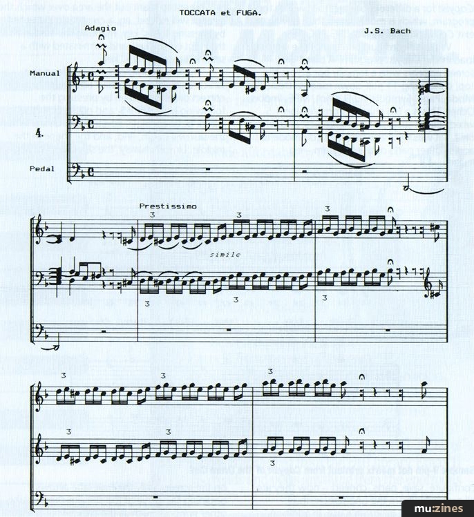 Printout from 9-pin dot matrix printer of the J.S Bach 'Toccata et Fuga' example file.
