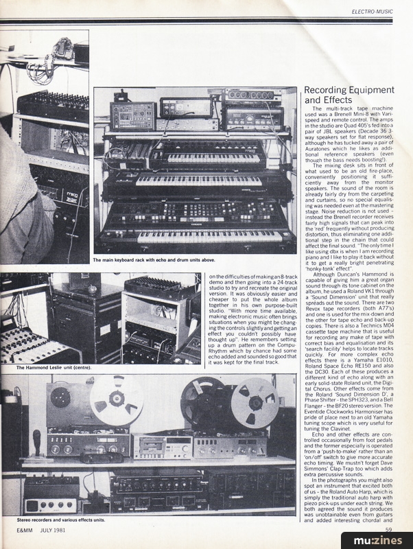You can listen to Duncan playing his studio keyboards on our E&MM Demo Cassette No. 3.