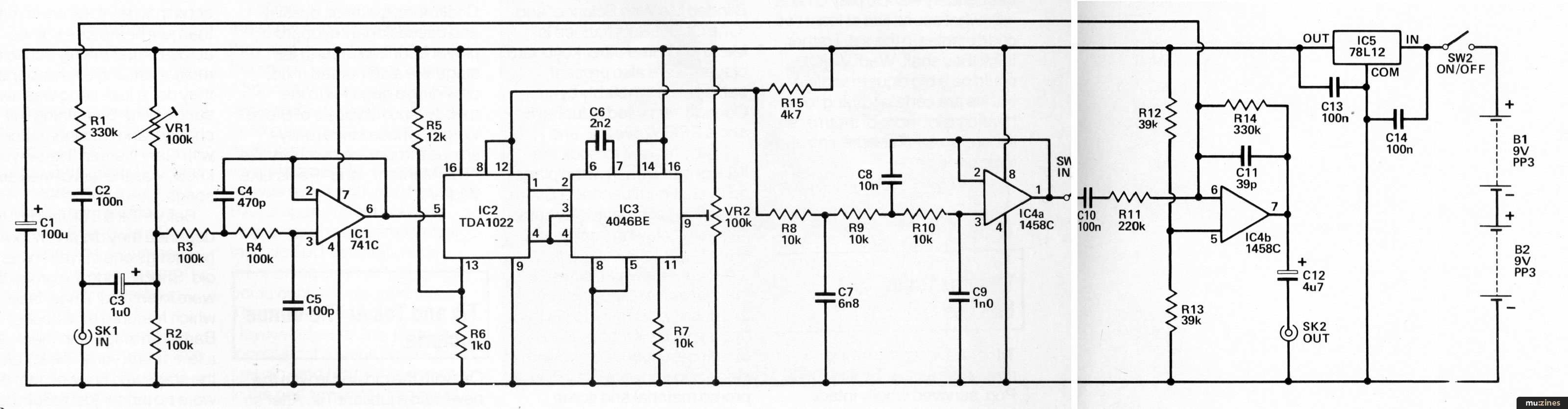 The full circuit diagram of the dual tracking unit is shown in Fig 2. IC1 is used as a standard 12dB per octave low-pass filter at the input of the unit, and its output is directly coupled to the input of the delay line chip (IC2). The clock signal is provided by IC3 which is a CMOS 4046BE phased locked loop. In this circuit the VCO section of this is used as the clock oscillator, and the device's phase comparators is used as the inverter to give the second clock phase. VR2 is used to control the clock frequency. IC4a is used as an 18dB per octave low-pass filter at the output of the delay line, while IC4b is used as a standard summing mode mixer circuit. C11 provides the mixer with its small amount of low-pass filtering. S1 can be used to disconnect the delayed signal from the mixer.