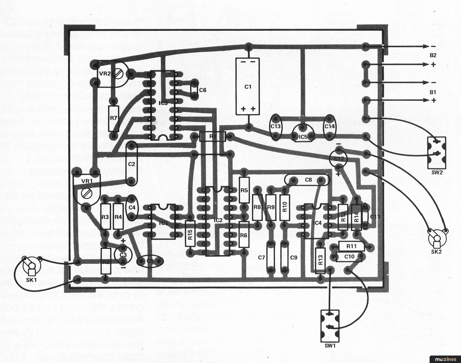 This circuit can be built into a console together with the other effects units described in this series, or it can be built as a stand-alone unit - a strong metal case is required, and a diecast aluminium. If we assume that it is constructed as a stand-alone type it's by far the most popular for effect units. These are both very tough and have good screening properties. S1 should be a heavy duty (latching) push button type mounted on the top panel of the case so that it can be foot operated. If something like a folded aluminium case and an ordinary push button switch are used it is unlikely that the unit would stand up to much rough treatment.