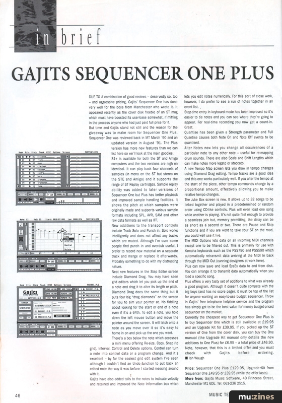 Currently the cheapest way to get Sequencer One Plus is to buy Sequencer One which is still available at £19.95 and an Upgrade Kit for £39.95. If you picked up the ST version of One from the cover disk, you can buy the One manual (the Upgrade Kit manual only details the new additions to One Plus) for £6.95 - a total price of £46.90. Note, however, that this is a limited offer and you must check with Gajits before ordering.