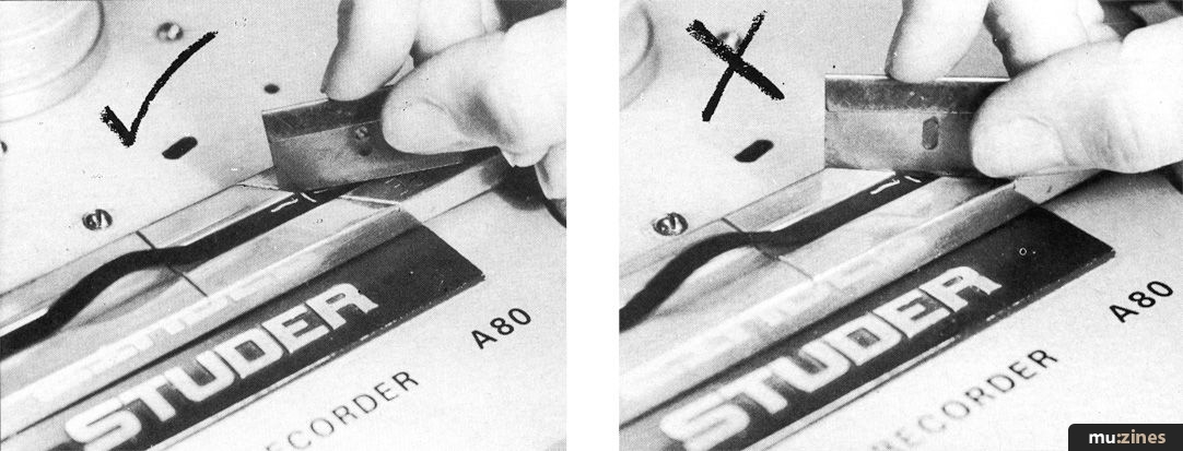 Is the blade sharp and innocent?? "You should really only use them for about ten edits", suggests Porky, "after that they're going to build up their own magnetism. You are working in an area with a magnetic field and that will slowly magnetise the blade which can be transferred to the tape." This puts a click on the tape, and, of course, if you try to splice it out, the same thing happens again. A cautious editor will demagnetise his blades at the start of the session in the same way that he'd demagnetise his tape deck and heads. Warning here: "Remind people that if they're defluxing a tape recorder, make sure it's turned off." Not a point made strongly or frequently enough, says Porky. Blown amps can result.
