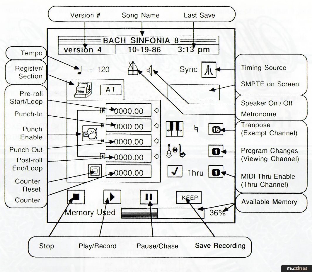 As many as 100 segments can be defined, which Hybrid Arts sensibly call 'sections'. The thing is that you record first, and define the section later. Do you see the five numerical counters on the control panel diagram? Well the first and fourth are the autolocate counters, which can be used to define the start and end of a section. By doing this, and clicking the mouse on the tracks you want to include in the section, it's done. It's very quick, and since each section is in 'continuous update' mode, you don't have to post it in the ledger or anything tedious like that.