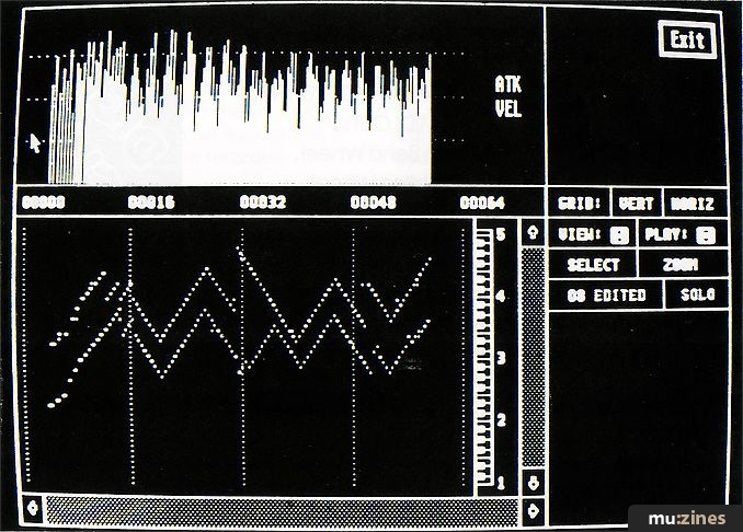 A completely different kettle of fish is the Graphics screen. If you're at all aware of grid manipulation techniques then you'll know what they can do for you (confuse you no end in my experience). In the top half of the screen, however, is something much more useful. As you can see from the photo, it's a quick editor for, among other things, attack velocity. Parameters that can be altered here include Attack Velocity, Release Velocity, Pitch Bend, Control Change, Common Aftertouch and Polyphonic Aftertouch (handy if you own an Ensoniq EPS or SQ80, etc). Is that enough? There are two methods of editing, both of which involve using the Atari's mouse.