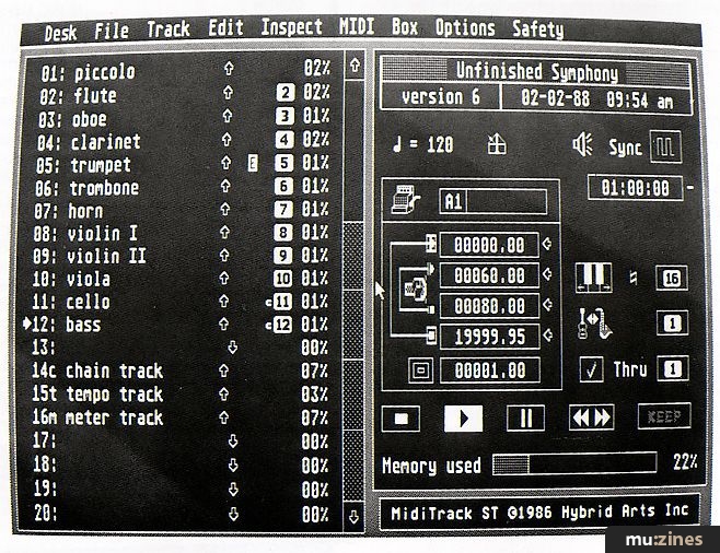 The boot disk contains a number of desk accessories, which can be prodded into action from the Desk menu. Among these are 'GenPatch', which is used in conjunction with Hybrid Arts' separate GenPatch ST program to send and receive System Exclusive data from your MIDI synthesizers [reviewed March 88]. There isn't much joy to be had if you don't already have this program, but if you are a keen GenPatch ST user, then it means not having to leave SmpteTrack to set up an instrument using System Exclusive. There is also the possibility of automatically setting synth patches on loading a song. This is called 'Auto GenPatch' would you believe?
