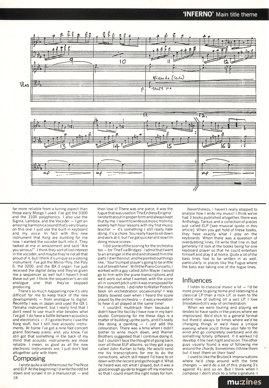 I couldn't multitrack then because I didn't have the facility I have now in my barn studio. Composing for me these days is a matter of building up the parts, and it's really like doing a painting — I just add the colouration. There was a time when I didn't bother to write much down, and Warner Brothers suggested that I continue doing it, but I couldn't face the thought of going back over all those ELP albums, so they got a guy called John Kurtan to help. He would send me his transcriptions for me to do the corrections, which still meant I'd have to sit down with the record and go through it. What he heard was not what I played, but it was a good enough guide to trigger off my memory so that I could insert the right notes for him.