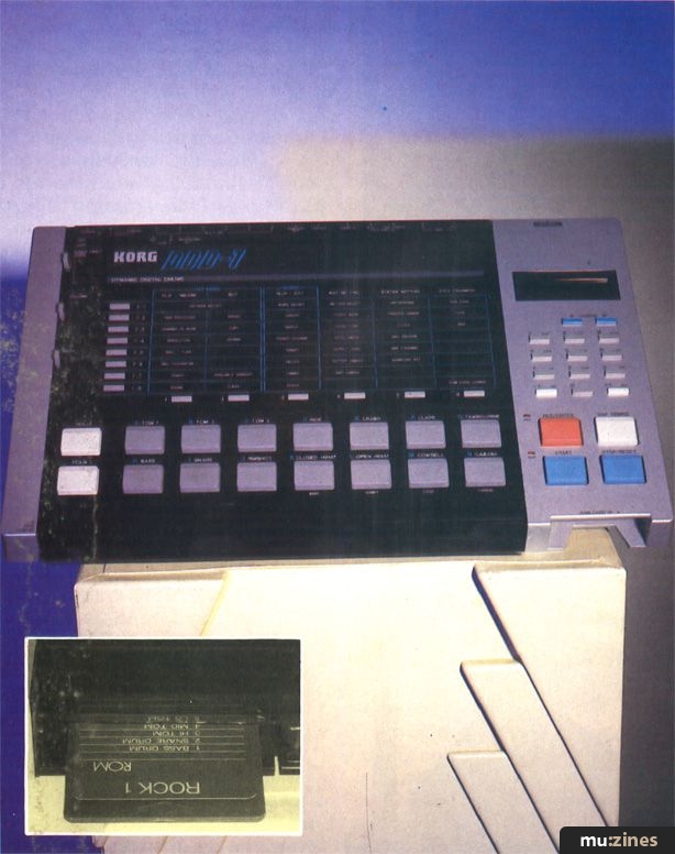 In addition to Tape and MIDI, the Korg can dump its entire memory to something literally the size of a credit card: the RAM card. It can also add new drum voices to its 18 on-board sounds in the same way, via a ROM card. Each of these carries a minimum of two long sounds, and a maximum of eight. Up to four ROM cards can be inserted into the machine at once, and the voices on them used simultaneously with the internal voices. A library of seven kits, six sets of percussion, four sets of sound effects, and three of cymbals already exist, with more on the way.