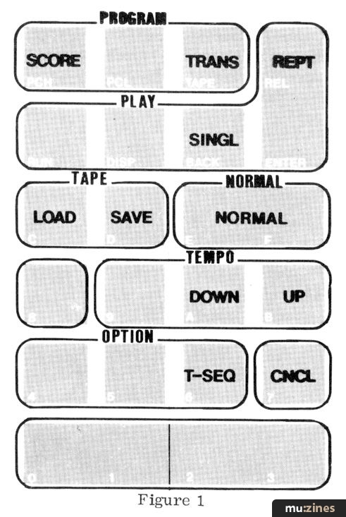 The TAPE pads control a couple of operating modes which should also be useful. TAPE SAVE causes the M-sequence and T-sequence information currently in the computer's memory to be dumped to magnetic tape. When you come up with a "keeper", start your recorder going (recording) and touch TAPE SAVE. After a short leader and synchronizing tone is generated, the displays will start to count and within a few seconds your complete composition will be stored as data on the tape (a hint — always save things twice).