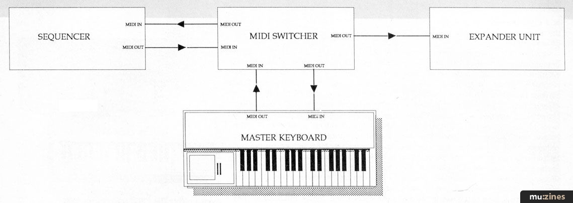 OK. NOW ITS time for some fun. To really understand how a sequencer works and why it's such a useful tool, you need some more specific practical examples. Starting from where we left our system last month, the master keyboard and expander module are connected via a MIDI switcher box. So the first thing that needs to be done is to connect the sequencer into the system (see Figure 2). In this example, the MIDI Out of the master keyboard is routed to the sequencer's MIDI In and vice versa, so the expander can be controlled by either of the two - depending on which input is switched in as the controller. Because the sequencer initially has no information to send to the expander, the original setup should have the keyboard controlling it.