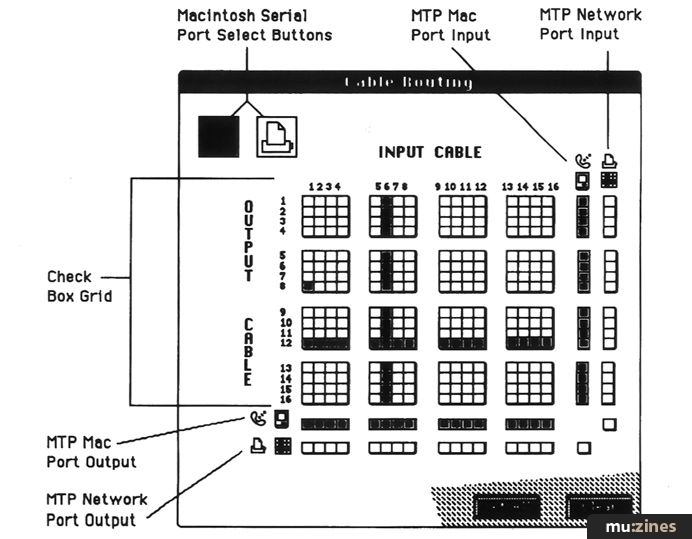 The 16x16 check box grid refers to an MTP's eight MIDI Ins and eight MIDI Outs. There are 16 because each Macintosh serial port can have up to two MTPs connected (MTP 1-8 and MTP 9-16). If only one MTP is connected, then In/Outs 9-16 are irrelevant.