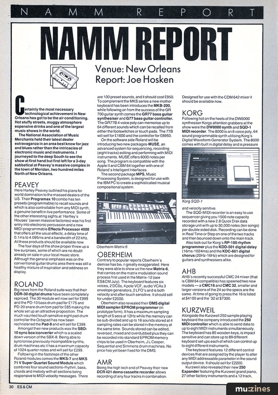 Contrary to popular reports Oberheim's demise has been greatly exaggerated. Here they were able to show us the new Matrix-6, that carries on the matrix modulation sound process first used in the Matrix-12 (see ES&CM July). The keyboard features six voices, 2 DCOs, 4 pole VCF, audio VCAs, 3 envelope generators, 2 LFO's and is both velocity and after touch sensitive. It should sell for under £2000.