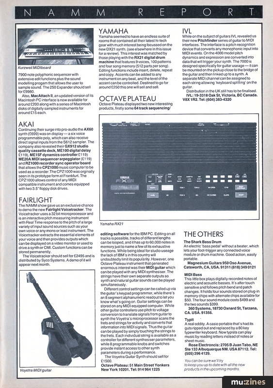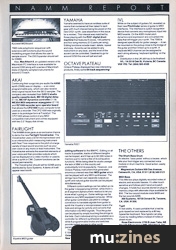 Octave Plateau displayed two new interesting products, firstly some 64 track sequencing/editing software for the IBM PC. Editing on all tracks is possible, tracks of different lengths can be looped, and it has up to 60,000 notes in memory just to name a few of its exhaustive functions. While being ideal for studio usage the lack of IBM's in this country will undoubtedly limit its popularity. However, one Octave Plateau instrument that generated enormous interest was their MIDI guitar which can be played with any MIDI synthesiser. The strings have their own separate outputs so synth and natural guitar sounds can be played simultaneously.