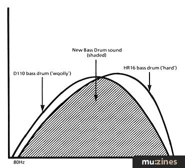 As a possible pop music experience, I felt the whole project was nearly there. I wanted to push it further and I wanted a 'bass drum to end all bass drums' (I'm ridiculously ambitious) to underpin the whole production. After a few phone calls to Will Mowat (thanks Will), C-Lab's UK expert, and after trying out an incredible number of bass drum combinations, I managed to get two bass drums (from a Roland D110 and Alesis HR16) playing together without flamming, delay or trigger problems. Because the resulting bass drum (see Figure 1) had a unique combination of woolly bottom-end and hardness (I ignored the 'clicks' at the start - so passe, and to my mind not really a characteristic of bass drums), I could put it very loud in the mix and it sounded good.