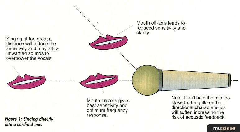 It's one thing having the right mic, but a certain amount of microphone technique is necessary to get the best out of it. Obviously the loudest results are obtained with the microphone very close to the mouth, and many rock singers work with their lips almost touching the wire grille, but you also need to sing directly into the end of the mic, not across the top of it as so many club entertainers seem to do. Figure 1 shows the correct mic position — cardioid mics are designed to be most sensitive to sounds in this direction and also produce the most accurate sound when used on-axis. However, the so-called proximity effect causes a noticeable bass boost whenever the mic is used very close to the source. Although experienced performers can vary their mic distance to make deliberate tonal changes, inexperienced singers may just end up with an uneven sound.