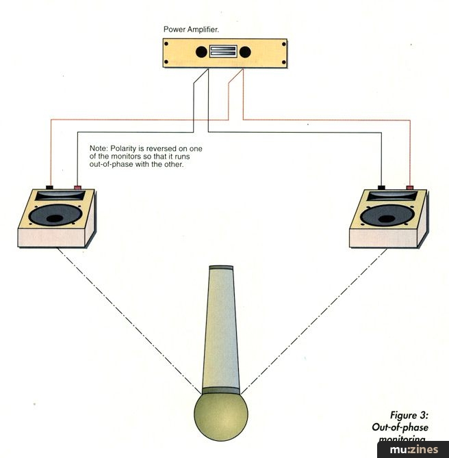 Where it is practical to use two stage monitors, it is possible to wire one out of phase with the other. As long as the monitors are placed symmetrically about the mic stand, the direct sound from the monitors reaching the mics will tend to cancel out, reducing the risk of feedback. However, the singer, having the benefit of two ears, will still be able to hear the monitors quite clearly. Figure 3 shows how this might be arranged in practice.