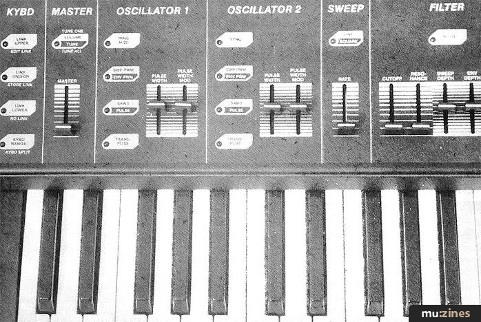 The soundmaking uses two oscillators to each voice for its 6-note velocity sensitive playing, with analog-style controls for synthesising the program voices. There are 11 vertical sections across the control panel for sequencer, keyboard program linking, master volume and tuning, synth parameter control (including an assignable section for pedal/footswitch control, oscillator modulation and detune), plus a large group of bank/program select touch pads that will call up program sounds by a letter (A-K) and number (1-12) combination as well as allow programs and sequences to be saved, loaded and edited. Finally, there are important 'housekeeping' functions for setting in and out routing, MIDI diagnostic checks and various operating adjustments.