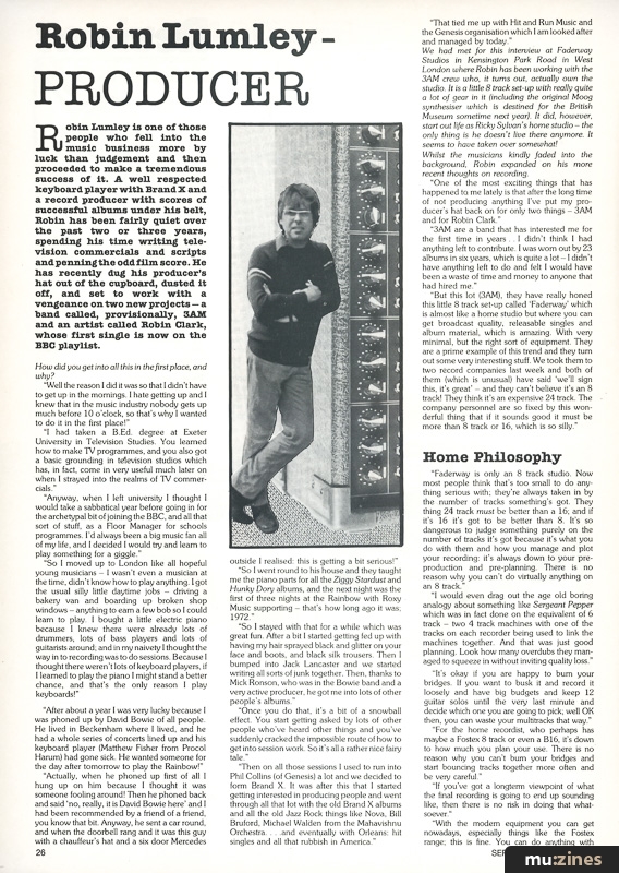 Robin Lumley is one of those people who fell into the music business more by luck than judgement and then proceeded to make a tremendous success of it. A well respected keyboard player with Brand X and a record producer with scores of successful albums under his belt, Robin has been fairly quiet over the past two or three years, spending his time writing television commercials and scripts and penning the odd film score. He has recently dug his producer's hat out of the cupboard, dusted it off, and set to work with a vengeance on two new projects — a band called, provisionally, 3AM and an artist called Robin Clark, whose first single is now on the BBC playlist.