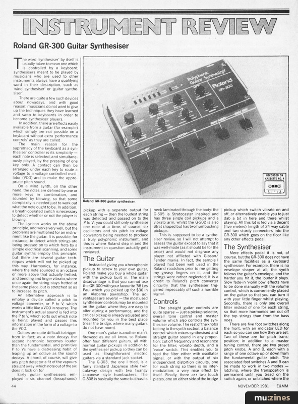 Early guitar synthesisers employed a six channel (hexaphonic) pickup with a separate output for each string — then the loudest string was detected and passed on to the P to V; you could still only synthesise one note at a time, of course, six oscillators and six pitch to voltage convertors being needed to produce a truly polyphonic instrument, and this is where Roland step in and the instrument in question actually gets reviewed.