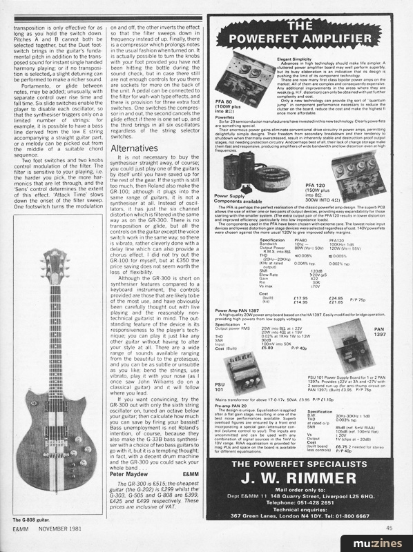 It is not necessary to buy the synthesiser straight away, of course; you could just play one of the guitars by itself until you have saved up for the rest of the gear. If the synth is still too much, then Roland also make the GR-100; although it plugs into the same range of guitars, it is not a synthesiser at all. Instead of oscillators, it has just the six channel distortion which is filtered in the same way as on the GR-300. There is no transposition or glide, but all the controls on the guitar except the voice switch work in the same way; so there is vibrato, rather cleverly done with a delay line which can also provide a chorus effect. I did not try out the GR-100 for myself, but at £350 the price saving does not seem worth the loss of flexibility.