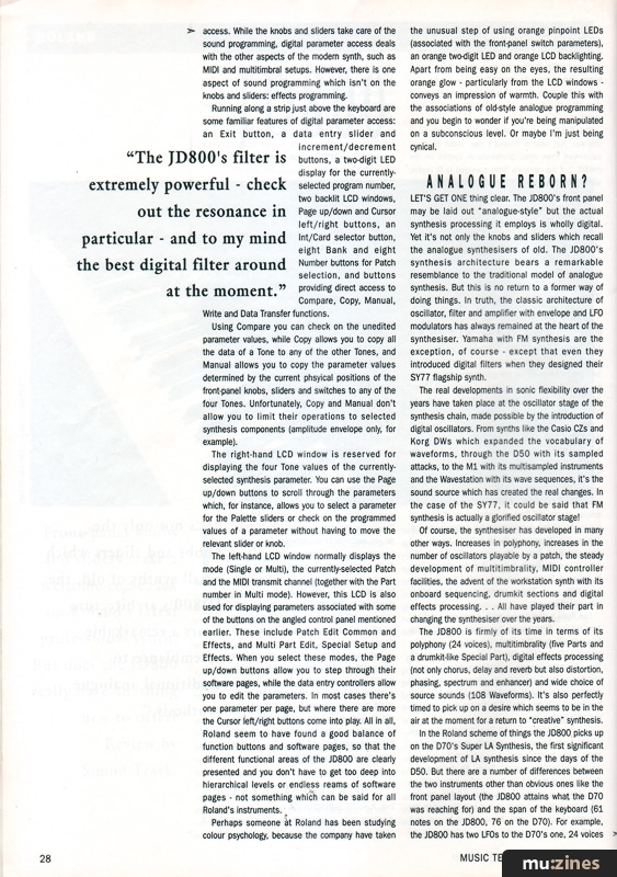 LET'S GET ONE thing clear. The JD800's front panel may be laid out "analogue-style" but the actual synthesis processing it employs is wholly digital.