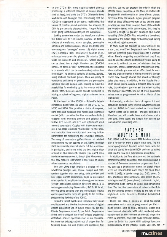 The JD800 is firmly of its time in terms of its polyphony (24 voices), multitimbrality (five Parts and a drumkit-like Special Part), digital effects processing (not only chorus, delay and reverb but also distortion, phasing, spectrum and enhancer) and wide choice of source sounds (108 Waveforms). It's also perfectly timed to pick up on a desire which seems to be in the air at the moment for a return to "creative" synthesis.