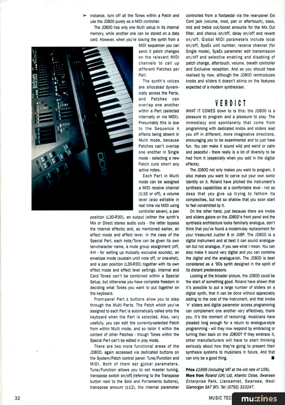 WHAT IT COMES down to is this: the JD800 is a pleasure to program and a pleasure to play. The immediacy and spontaneity that come from programming with dedicated knobs and sliders lead you off in different, more imaginative directions, encouraging you to be experimental and to just have fun. You can make it sound wild and weird or calm and peaceful - there really is a lot of diversity to be had from it (especially when you add in the digital effects).