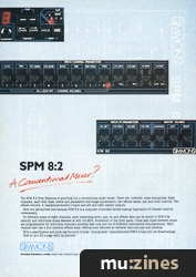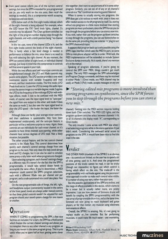 But the possible applications of the SPM are endless, and the range of effects available in this device, which claims to be a mixer but is actually rather more, are pretty impressive. I can see how owners of Simmons drums will benefit by coupling the SPM's programmability with the vast array of programmable drum kits, and at the same time, Simmons are now going to reach keyboard and guitar players, or for that matter, any musician using electronic instruments or effects.