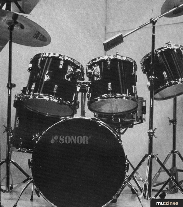 Heads: With the exception of the snare and the front of the bass drum, all the drums were fitted with Remo's see-through Ambassador heads. The snare has a coated Ambassador batter, and a normal Ambassador snare head. The coating I find gives a deal more audible penetration to the snare and strangely makes the drum sound more modern. It's weird this, because the coated Ambassador is the Weather King head which Remo started out with more than 25 years ago! The front head of the bass carries the Sonor logo, and is a black see-through Ambassador equivalent called Ebony.