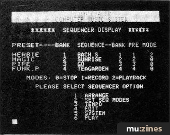 According to Passport, 'the Sequencer is an extraordinarily flexible and expressive sub system which expands your role from a performer/programmer to an arranger/conductor'. The SEQUENCER display in Figure 4 shows that four banks of presets (instruments programmed with the EDIT program) and sequences (notes or chords played on the keyboard) are available for arranging (setting a preset to a sequence), mode assignment (record, playback or off), and tempo variation (1 - fastest to 16 - slowest). Though the SEQUENCER will store a fairly long monophonic line if the tempo is slow, Passport are tempting providence by stating that each bank is 'capable of storing 2 to 16 minutes of music', as each of these is limited to only 256 events. This isn't exactly generous by contemporary standards of polyphonic sequencers, but the future is likely to see this extended to something like 16K-worth of storage.