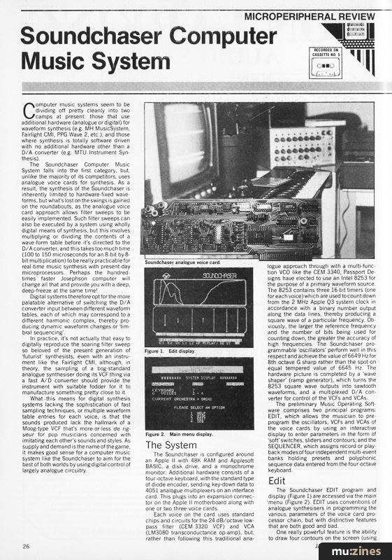 The Soundchaser is configured around an Apple II with 48K RAM and Applesoft BASIC, a disk drive, and a monochrome monitor. Additional hardware consists of a four-octave keyboard, with the standard type of diode encoder, sending key-down data to 4051 analogue multiplexers on an interface card. This plugs into an expansion connector on the Apple II motherboard along with one or two three-voice cards.