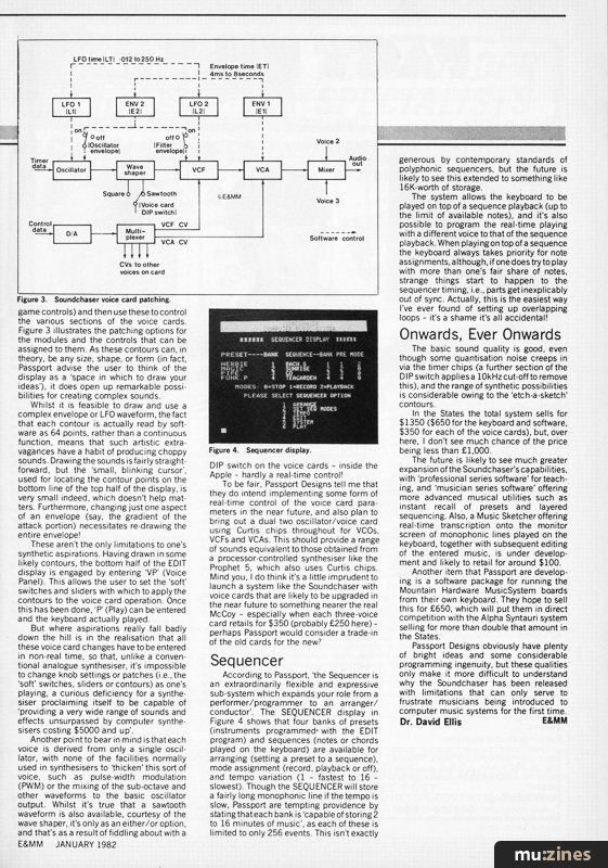 To be fair, Passport Designs tell me that they do intend implementing some form of real-time control of the voice card parameters in the near future, and also plan to bring out a dual two oscillator/voice card using Curtis chips throughout for VCOs, VCFs and VCAs. This should provide a range of sounds equivalent to those obtained from a processor-controlled synthesiser like the Prophet 5, which also uses Curtis chips. Mind you, I do think it's a little imprudent to launch a system like the Soundchaser with voice cards that are likely to be upgraded in the near future to something nearer the real McCoy - especially when each three-voice card retails for $350 (probably £250 here) - perhaps Passport would consider a trade-in of the old cards for the new?
