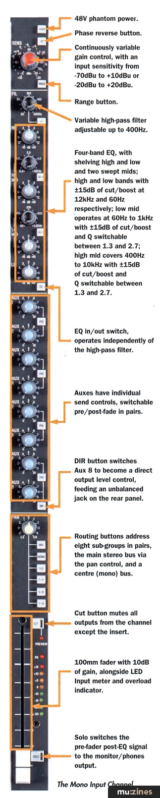 The channel insert, which appears on the rear panel, is unbalanced and uses a single stereo jack socket, ring send/tip return. I don't have a problem with it being unbalanced, although some balanced outboard equipment may come back at a lower level if used unbalanced. The insert point is between the high-pass filter and the main EQ, which I feel is the best place for it.